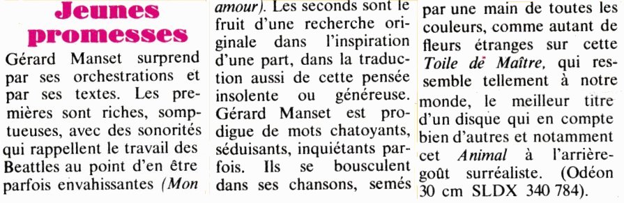 1969 Janvier - Jeunes promesses - Magazine Club 1971 Décembre - Vers la maturité - Super Hebdo 85 1970 Pub LP Mort d'Orion - Extra 2008 La Mort d'Orion - Article de RR - Volume 1971 Le père d'orion - Extra - Jean Marie Leduc 1970 Chronique LP Mort d'Orion - Jukebox Mag - Pierre Layani 1973 Mai - Pub Celui qui marche devant - Best 58 1974 Mars - Manset - Rock & Folk 86 - François René Christiani |
