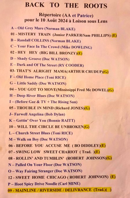 Mystery Train Hey Hey Saint Louis Blues Deep River Blues I Can't Be Satisfied Time For Movin' On Hans Olson Jam Boogie Sunny (Live) Help me (live) Honky Tonk Women Perpetual Blues machine (live) The Man Behind The Guitar Proud Mary You Got To Move Alberta Trouble in mind Swing Low - Sweet Chariot Stop breaking down Little wing Mystery Train |