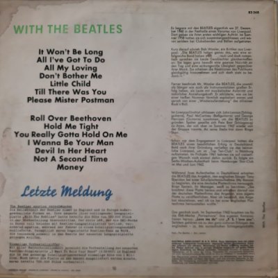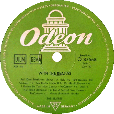 A1 It Won't Be Long (Lennon-McCartney) A2 All I've Got To Do (Lennon-McCartney) A3 All My Loving (Lennon-McCartney) A4 Don't Bother Me (Harrison) A5 Little Child (Lennon-McCartney) A6 Till There Was You (Willson) A7 Please Mister Postman (Holland) B1 Roll Over Beethoven (Berry) B2 Hold Me Tight (Lennon-McCartney) B3 You Really Got A Hold On Me (Robinson) B4 I Wanna Be Your Man (Lennon-McCartney) B5 Devil In Her Heart (Drapkin) B6 Not A Second Time (Lennon-McCartney) B7 Money (Gordy, Bradford) |